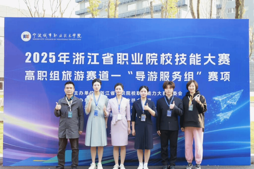 在2025年3月21—23日举行的浙江省职业院校技能大赛高职组旅游赛道一“导游服务组”赛项中,我院参赛团队凭借扎实的专业技能和出色的团队协作,取得了较好成绩。其中,蓝晨毅、黄晨曦、李仁梅、卢妤洒四位同学,在黄刚、邓捷老师的悉心指导下,以“经济大省挑大梁”和东西部协作为主题的项目荣获大赛银奖;张麦莎、郑明静、蒋佳浩、俞然四位同学,在段学成、徐利老师的指导下,以蚂蚁岛红色旅游为主线、拒绝“躺平”为主题的项目荣获大赛铜奖。
