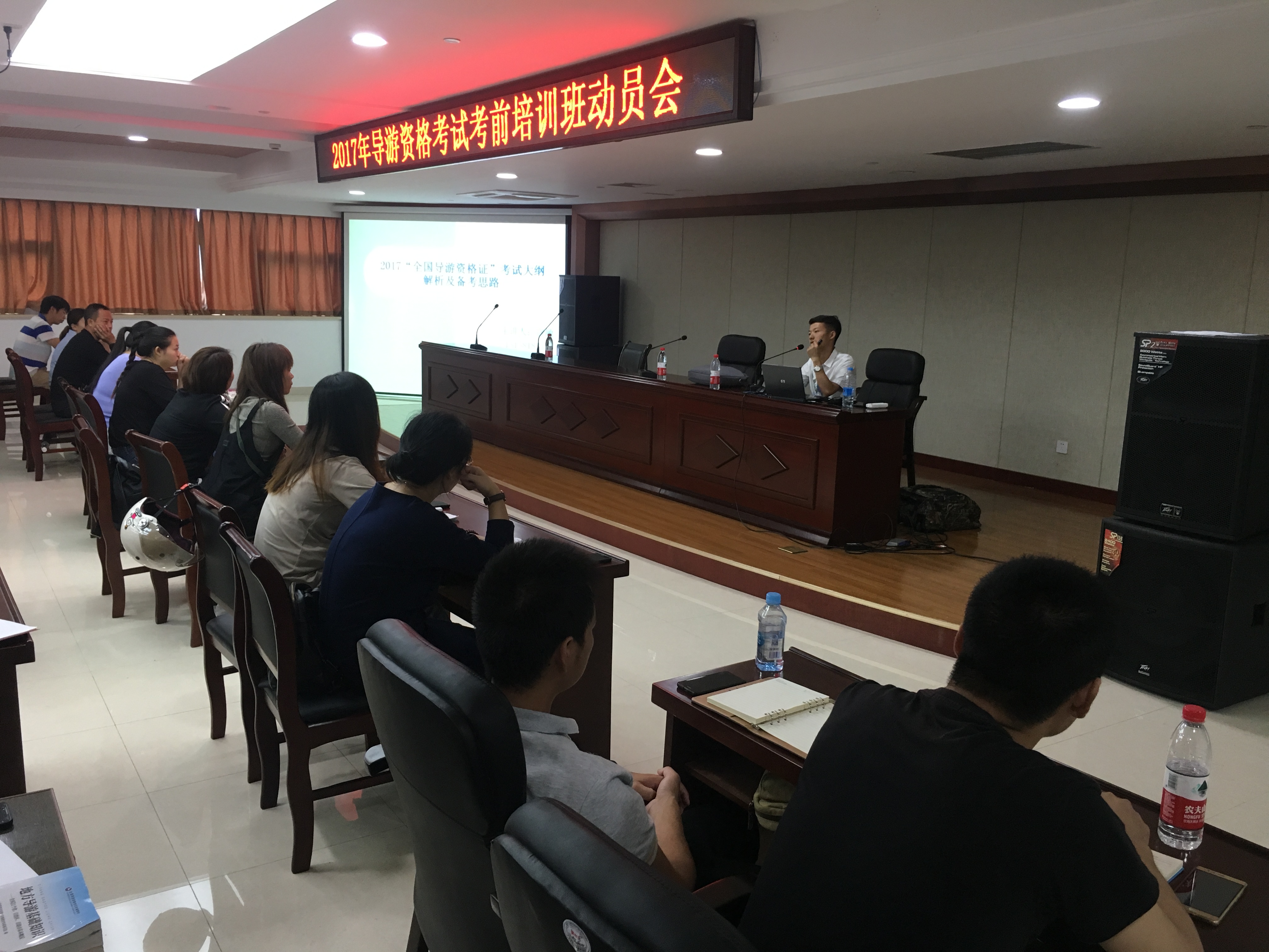 今年是全国“导考”改革第二年,且新增设《地方导游文化基础知识》课程,考证难度大大超过往年,全国旅游院校都摸着石头过河。面对如此大难度的国家级考试,我校旅游分院在领导的关心和支持下,创新性地采用“导考项目负责制”,即:以“导考”的策划和实施为核心,项目总负责人全面负责导考过程中涉及的组织、排课、辅导以及考场布置、考评员接待等各项事宜,导游教研室黄刚老师、宣敏老师、荣海涛老师、娄月红老师、杨奇美老师组建的导考辅导团队同心协力、目标一致、精心准备、无私付出,倾注了大量的时间和心血,在整个过程中,导考辅导团队全程跟进,时刻鞭策,督促学生备考,在全校范围内营造导考氛围,使“无导考,不青春”口号在学生心中打响。