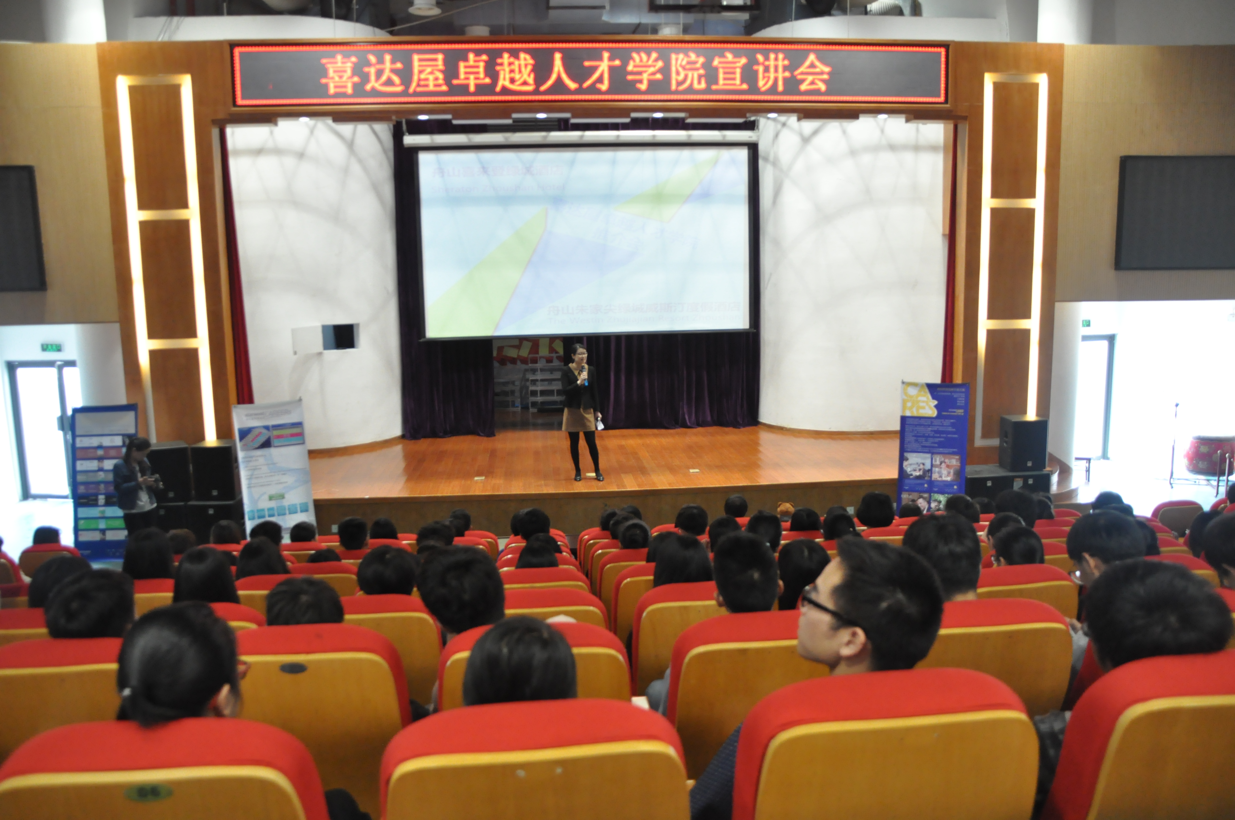4月29日下午,春风习习、阳光灿烂,舟山旅游与健康职业学院迎来了舟山喜达屋人力资源余慧总监一行6人,到学校报告厅举办喜达屋卓越人才学院宣讲会。旅游分院院长冯文昌、党总支书记曹志斌、酒店管理专业师生共二百多人参加了此次宣讲会。宣讲会由冯文昌院长主持。余总监等分别与大家分享了他们各自的从业经历,还详细介绍了喜达屋核心价值观、人才成长路径、员工活动和福利等方面的企业文化,并一起观看了集团宣传视频。喜达屋酒店及度假村国际集团是世界著名的酒店管理集团,在世界各地拥有一千多家酒店,在中国开业与未开的酒店就达二百家之多。随着酒店集团的快速发展,对本土专业人才的需求十分迫切,他们希望通过校企合作共同培养专业人才,以满足集团事业发展的需要,也为中国酒店业的崛起贡献一份努力。