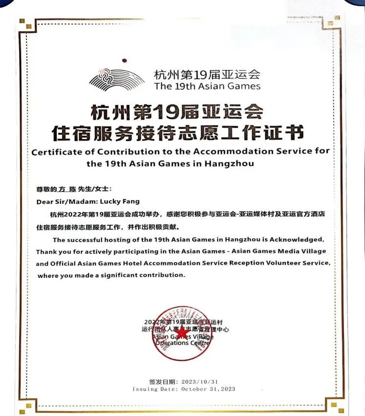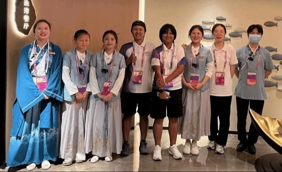 2023年9月对她来说是具有特殊的意义的时刻,她凭借真诚、热情的态度及扎实的工作表现脱颖而出,经过层层选拔与严格培训,最终成为了第19届杭州亚运会餐饮服务志愿者。她的专业素养和服务精神与亚运会的高标准和高要求完美契合。她提前了解不同国家和地区运动员的文化习俗,为即将到来的服务工作精心筹备。她深知肩负着重大责任与使命,深入学习食品安全、餐饮禁忌及应急处理等知识,精心筹备。开幕后,她坚守餐饮服务区域,始终保持微笑和专注,引导运动员有序取餐。