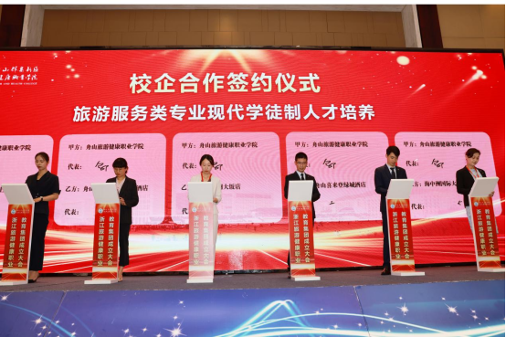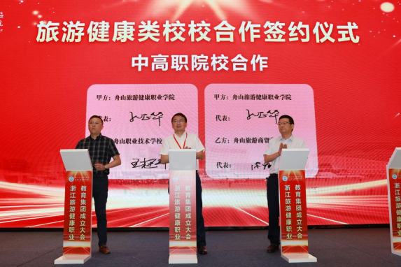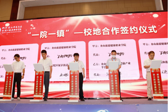 成立大会上,举行了舟山市职业教育研究中心揭牌,新区文旅产业学院和海岛康养产业学院授牌,学校与定海工业园区管委会、普陀区展茅街道办事处、普陀区大健康产业平台工作组、沈家门渔港小镇“一院一镇”校地合作签约,学校与宁波城市职业技术学院、宁波卫生职业技术学院甬舟旅游健康类高职院校合作签约,与舟山职业技术学校、舟山旅游商贸学校旅游健康类中高职院校合作签约,以实现行业内资源共享、产业间密切合作、区域内共生联动、区域间优势互补,促进教育链、人才链与产业链、创新链的有机衔接,提高职业技术教育质量、扩大学生就业创业、推进经济转型升级、培育经济发展新动能。