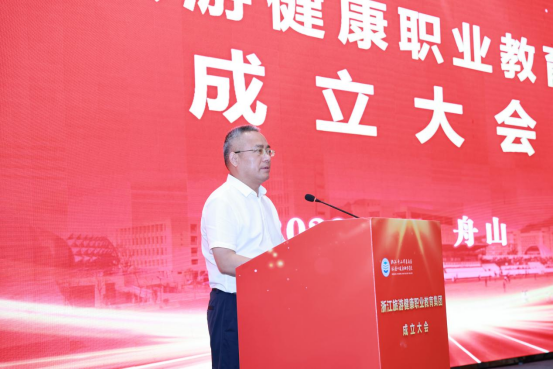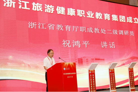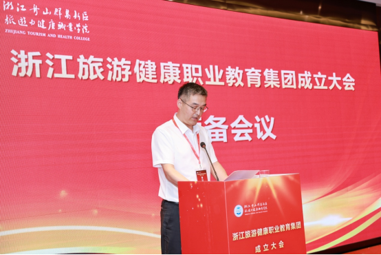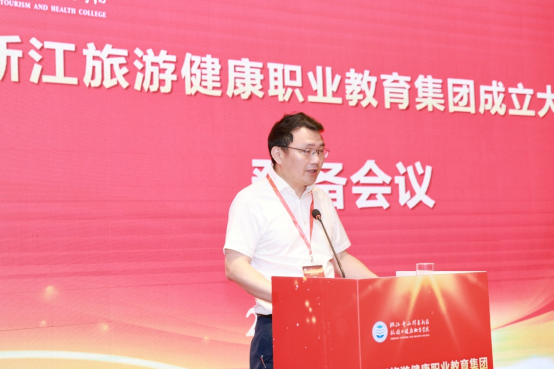 教育部示范职业教育集团、浙江旅游职业教育集团代表,浙江旅游职业学院副校长王忠林代表兄弟教育集团致贺词。王忠林表示,浙江旅游职业教育集团与浙江旅游健康职业教育集团将携手同行、精诚合作,讲信修睦、守望相助,坚守育人初心,不负时代使命,探索产教融合育人新增长极,以“浙江精神”为文化和旅游业发展注入不竭动力。