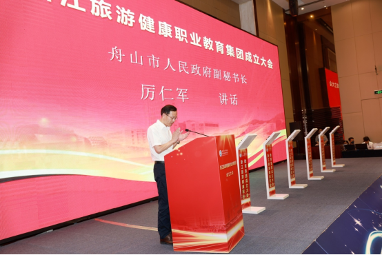 2022 年 7 月 15 日,浙江旅游健康职业教育集团成立大会在舟山海中洲国际大酒店隆重举行。舟山市政府副秘书长厉仁军,浙江省教育厅职业教育与成人教育处二级调研员祝鸿平,省文化和旅游厅科技与教育处副处长赖宋平,世界中医药学会联合会中医健康管理专业委员会副会长、浙江中医药大学党委副书记张光霁,舟山市教育局党委书记、局长陈海波,教育部示范职业教育集团、浙江旅游职业教育集团代表、浙江旅游职业学院副校长王忠林,舟山市卫生健康委员会副主任金秀国,市民政局四级调研员赵金峰,市文化和广电旅游体育局四级调研员刘君英等省市相关部门、职业院校、企事业单位、行业协会的领导和代表,以及学校党委书记姚奇富等领导班子成员出席成立大会。校长郑能波主持成立大会,副校长孔志华主持预备会议。全体中层干部参加成立大会。