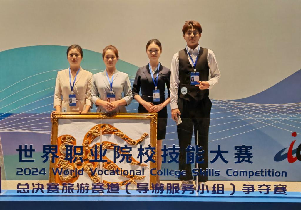2024年10月25日至27日,由国家教育部等单位主办、上海市教育委员会承办,上海旅游高等专科学校协办,由全国职业院校技能大赛升级而成的2024年世界职业院校技能大赛总决赛旅游赛道(导游服务小组)争夺赛在上海举行。由旅游学院院长杨奇美、专任教师荣海涛指导,22级导游2班陈莹雪、22级酒店管理与数字化运营1班余易敏、23级导游2班宋静静、23级导游1班吴帅组成的代表队,作为代表浙江省的两支代表队之一,与来自全国63所高职院校的238位选手同台竞技,经过为期两天的激烈角逐,最终凭借卓越的专业素养和出色的现场表现,斩获金奖,为我校实现历史性突破。
