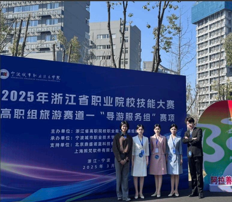 在2025年3月21—23日举行的浙江省职业院校技能大赛高职组旅游赛道一“导游服务组”赛项中,我院参赛团队凭借扎实的专业技能和出色的团队协作,取得了较好成绩。其中,蓝晨毅、黄晨曦、李仁梅、卢妤洒四位同学,在黄刚、邓捷老师的悉心指导下,以“经济大省挑大梁”和东西部协作为主题的项目荣获大赛银奖;张麦莎、郑明静、蒋佳浩、俞然四位同学,在段学成、徐利老师的指导下,以蚂蚁岛红色旅游为主线、拒绝“躺平”为主题的项目荣获大赛铜奖。