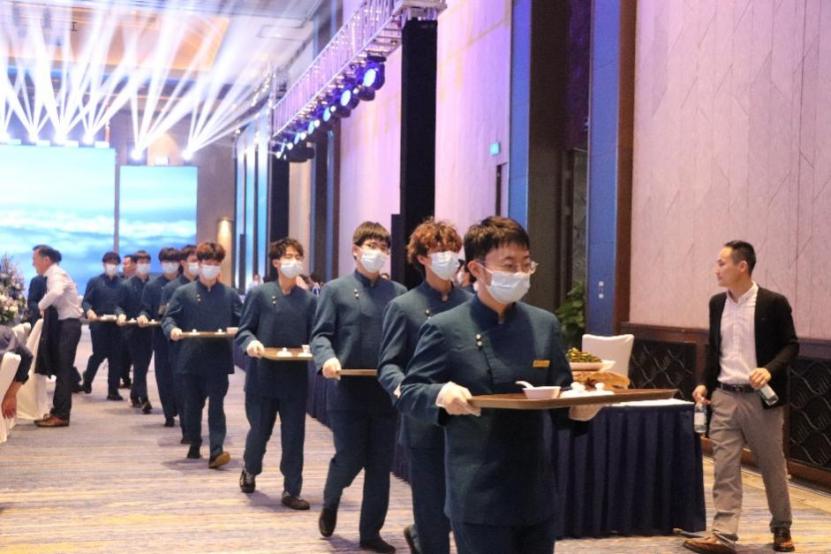 大会期间,这支队伍始终秉持“高标准、严要求”准则,将岗位需求内化于心、岗位职责外化于行。在科学分工、明确协作的工作体系下,志愿者们保持饱满的精神状态与严谨的工作态度,全面参与会议服务的关键环节;不仅高效完成迎宾引位、嘉宾引导等礼仪接待工作,以亲切得体的举止展现东道主风采;更精准配合酒店完成斟酒上菜、流程衔接等高规格宴会服务,用细致周到的保障让每一位与会嘉宾获得优质参会体验。从会场引导到细节服务,志愿者们的默契协作与专业表现,成为大会现场一道亮眼的 “青春风景线”。